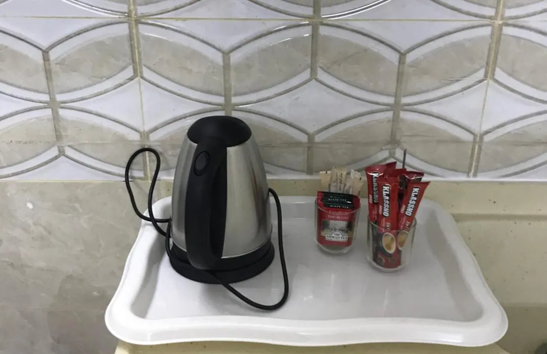 Profitez de la cuisine équipée fournie dans la propriété et équipée d'une bouilloire électrique, d'un réfrigérateur et de la vaisselle pour votre confort.